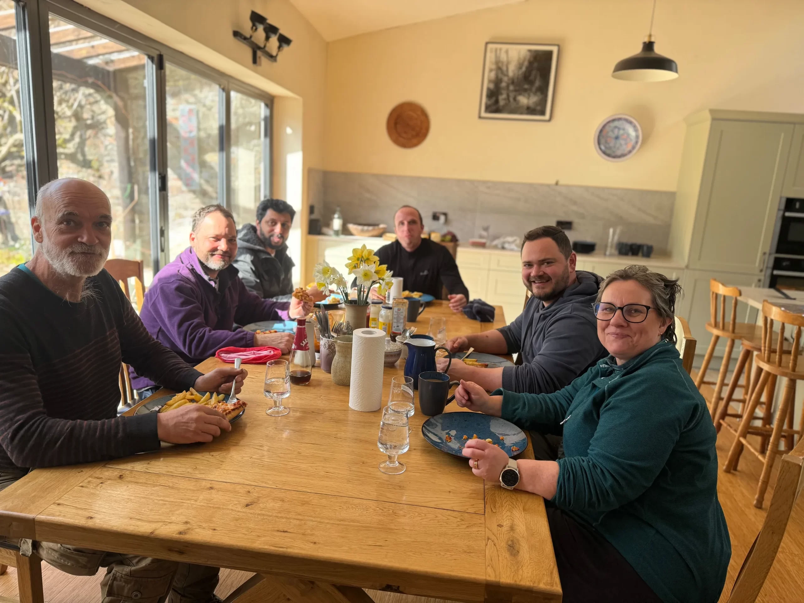 After several hours of planting, we were treated to a delicious homemade lunch by our hosts, Terry and Jane. Their kitchen offered a warm and welcoming atmosphere, where we enjoyed homemade pizzas, crispy chips, and an assortment of cakes and cheeses. The food was the perfect way to refuel after a productive morning of tree planting.